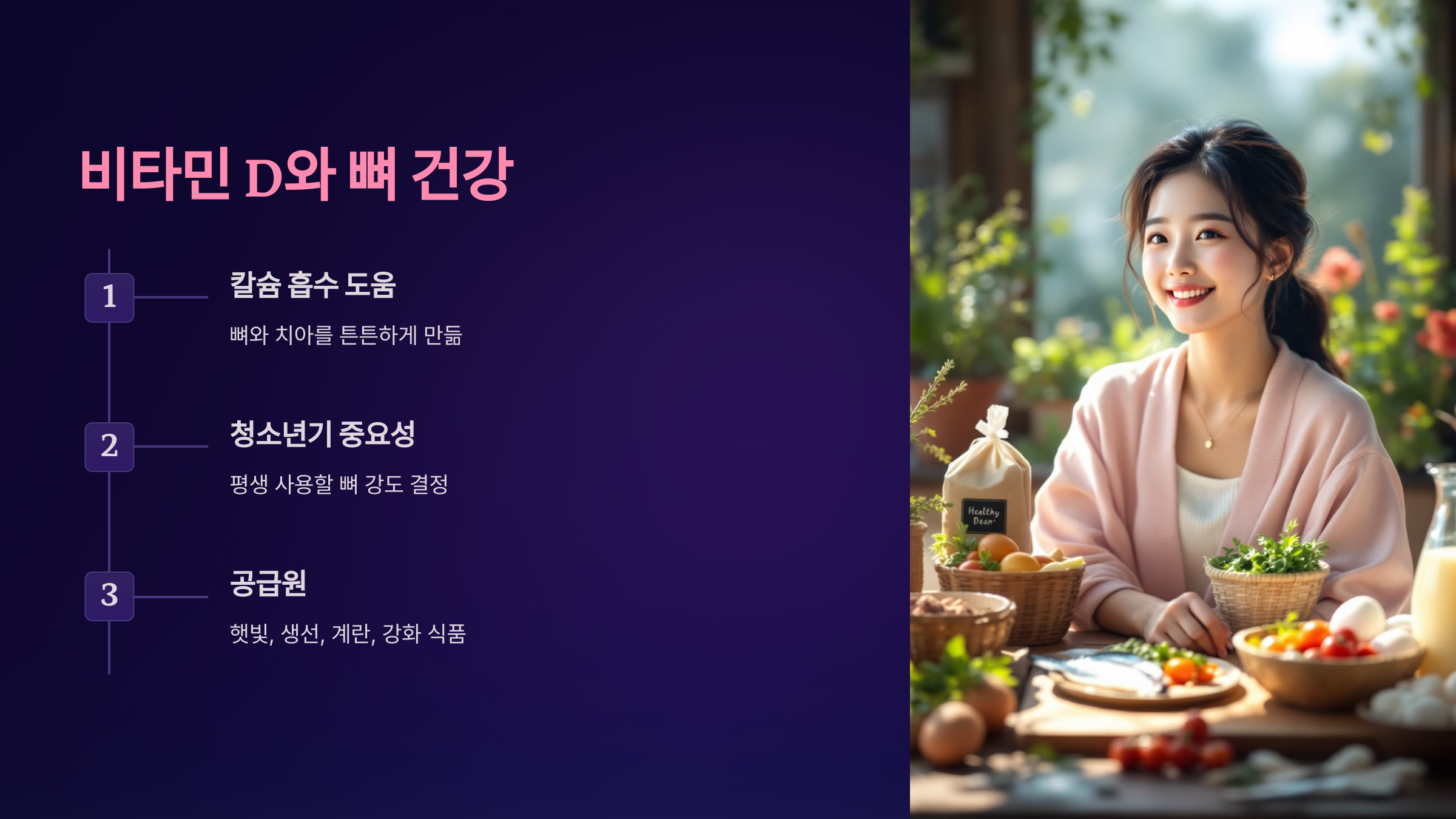 비타민 D의 가장 중요한 역할 중 하나는 우리 몸이 칼슘을 흡수할 수 있게 돕는 것입니다. 칼슘은 뼈와 치아를 튼튼하게 만들어 주는 미네랄로, 마치 건물의 철골 구조와 같다고 할 수 있죠. 비타민 D가 부족하면 아무리 칼슘이 풍부한 음식을 먹더라도 몸이 제대로 흡수하지 못하게 됩니다. 이렇게 되면 뼈가 약해져 골절 위험이 커질 수 있습니다.
