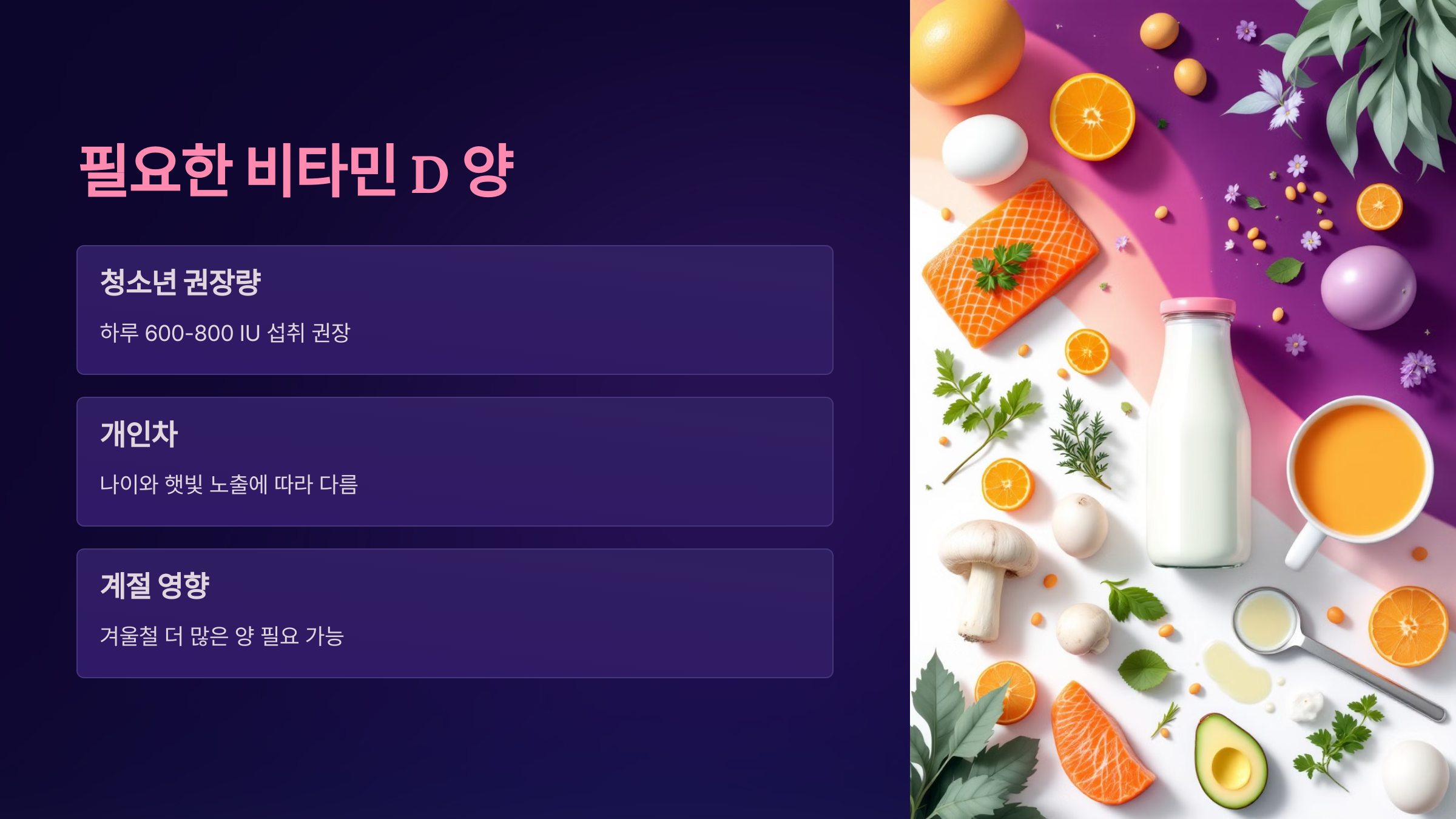 필요한 비타민 D의 양은 나이와 햇빛을 얼마나 쬐는지에 따라 다릅니다. 청소년의 경우 하루에 약 600-800 IU(국제단위)를 섭취하는 것이 권장됩니다. 하지만 햇빛을 덜 받는 지역에 살거나 겨울철에는 더 많은 양이 필요할 수도 있습니다.