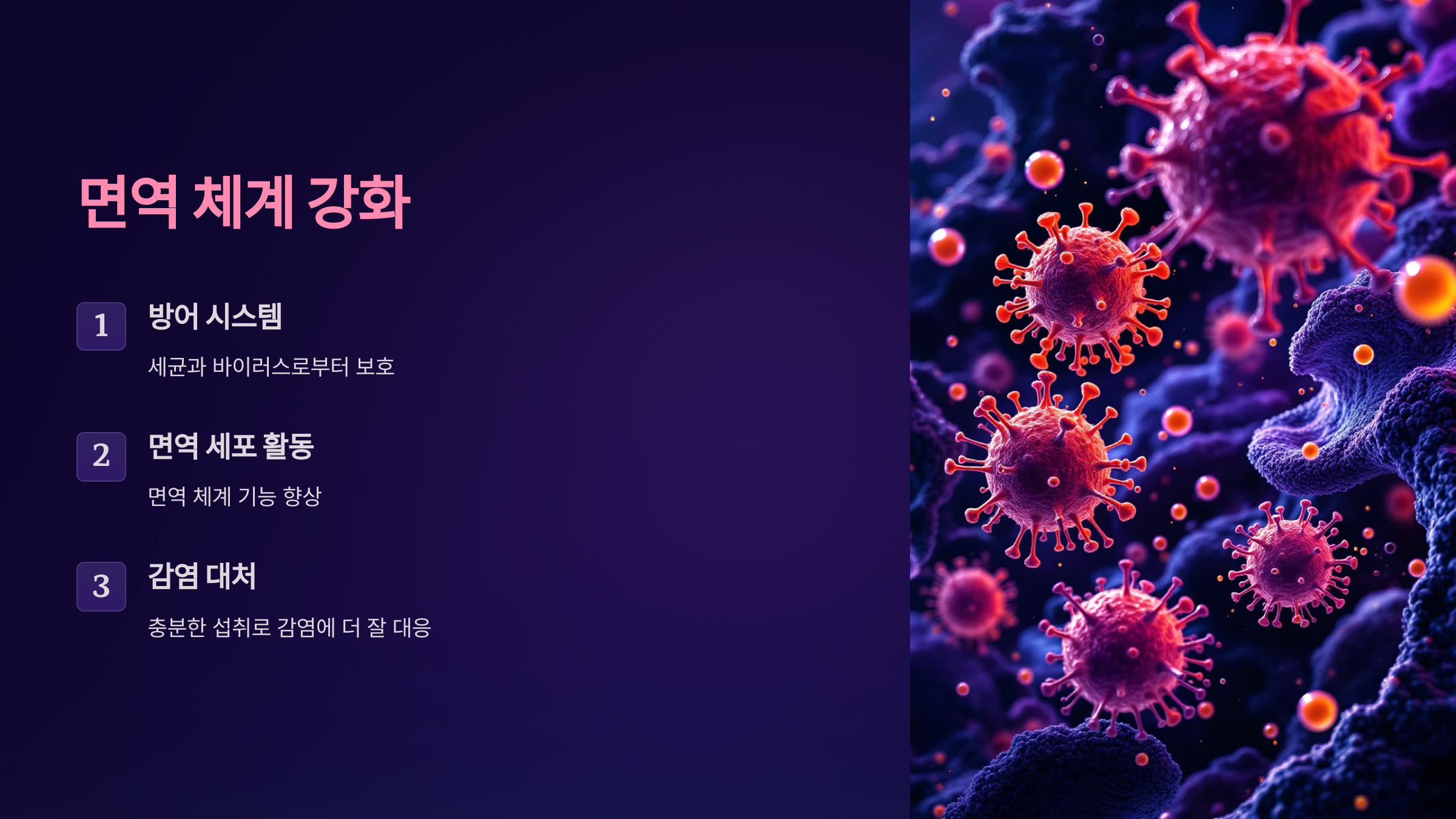 비타민 D는 면역 체계를 강화하는 데도 중요한 역할을 합니다. 면역 체계는 우리 몸을 세균이나 바이러스로부터 보호하는 방어 시스템입니다.