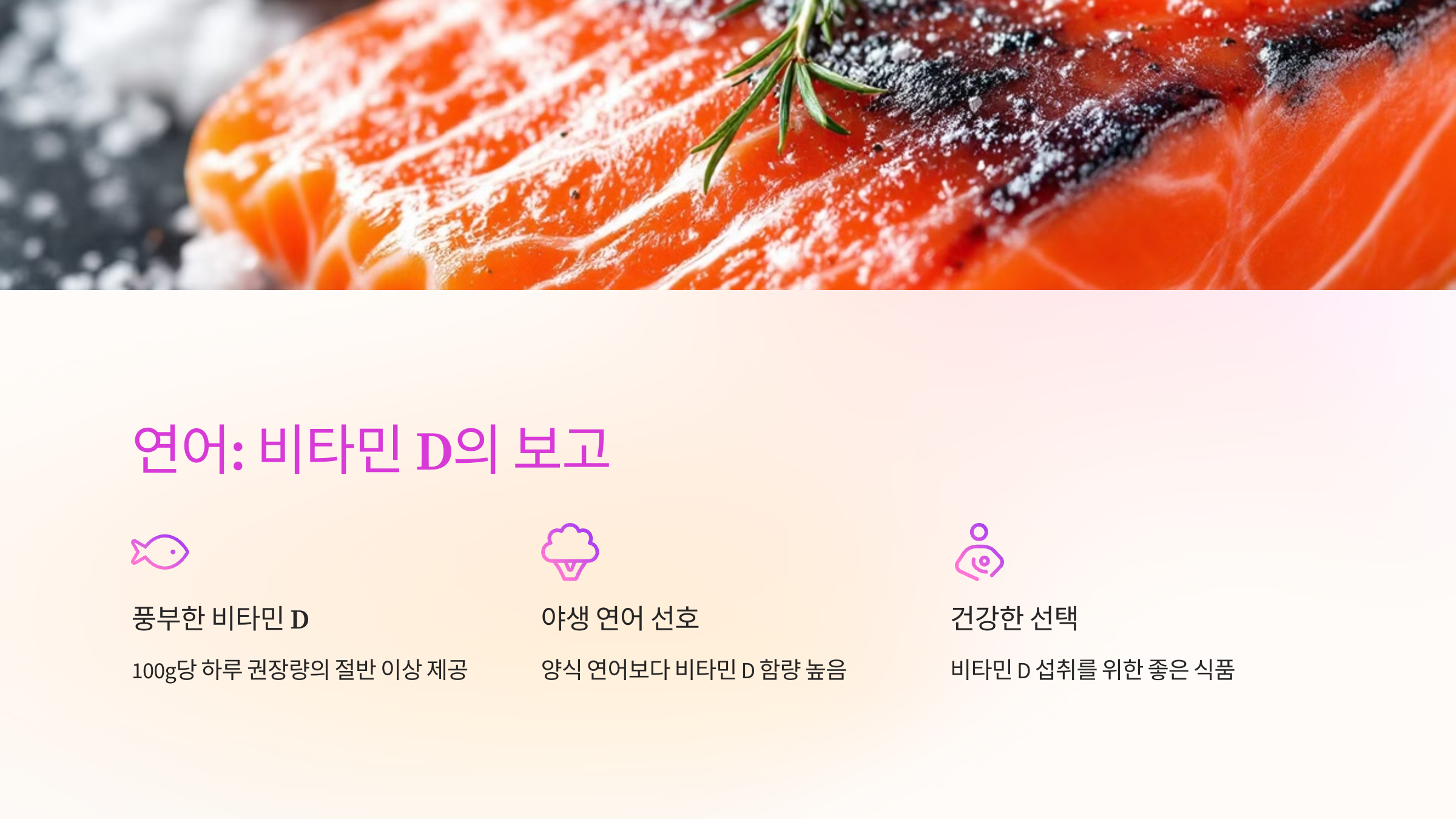 연어는 비타민 D가 풍부한 대표적인 생선으로, 100g당 하루 권장량의 절반 이상을 제공합니다. 특히 야생에서 잡은 연어가 양식 연어보다 비타민 D 함량이 높은 것으로 알려져 있으니 가능하다면 야생 연어를 선택하는 것이 좋습니다.