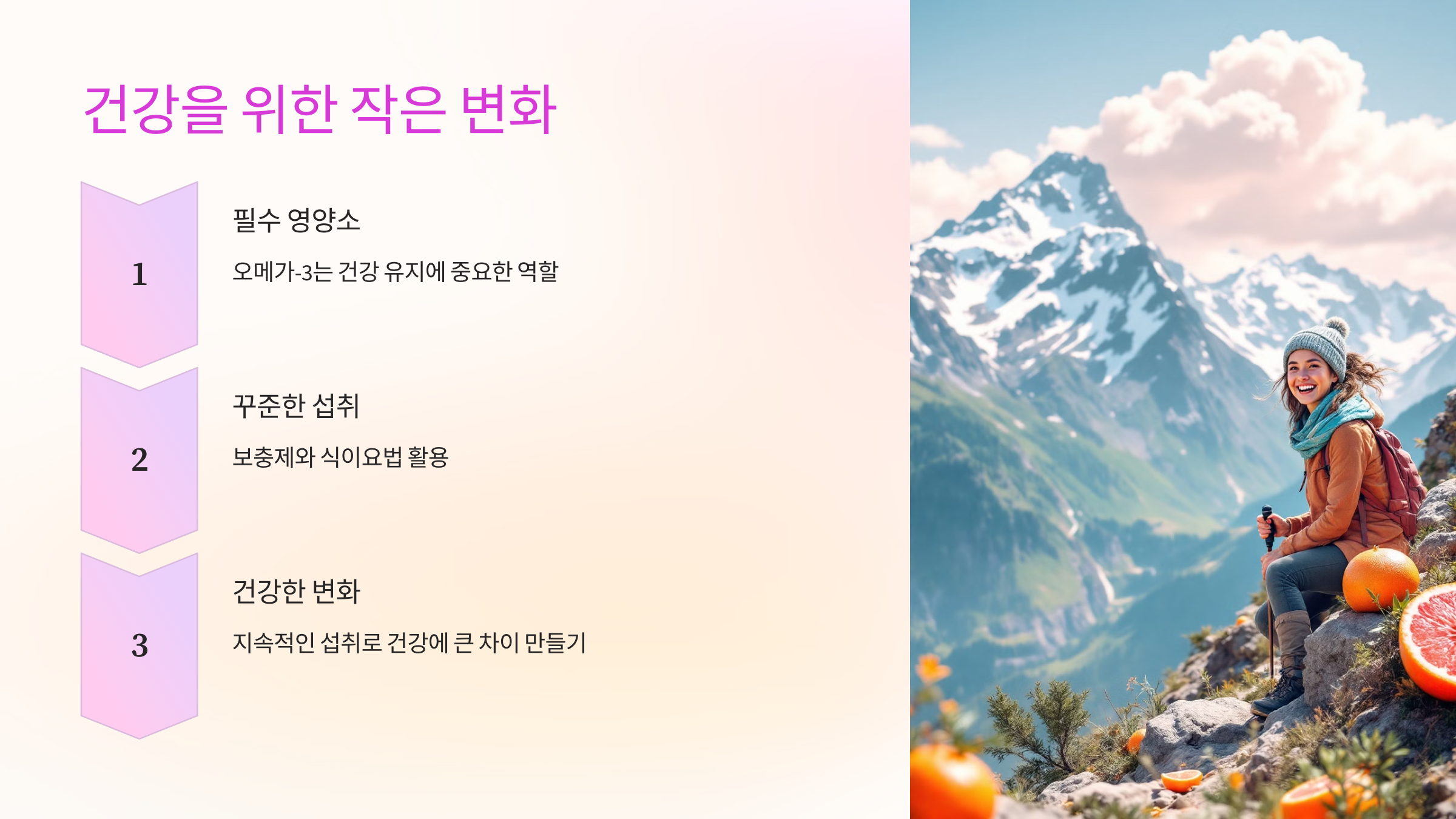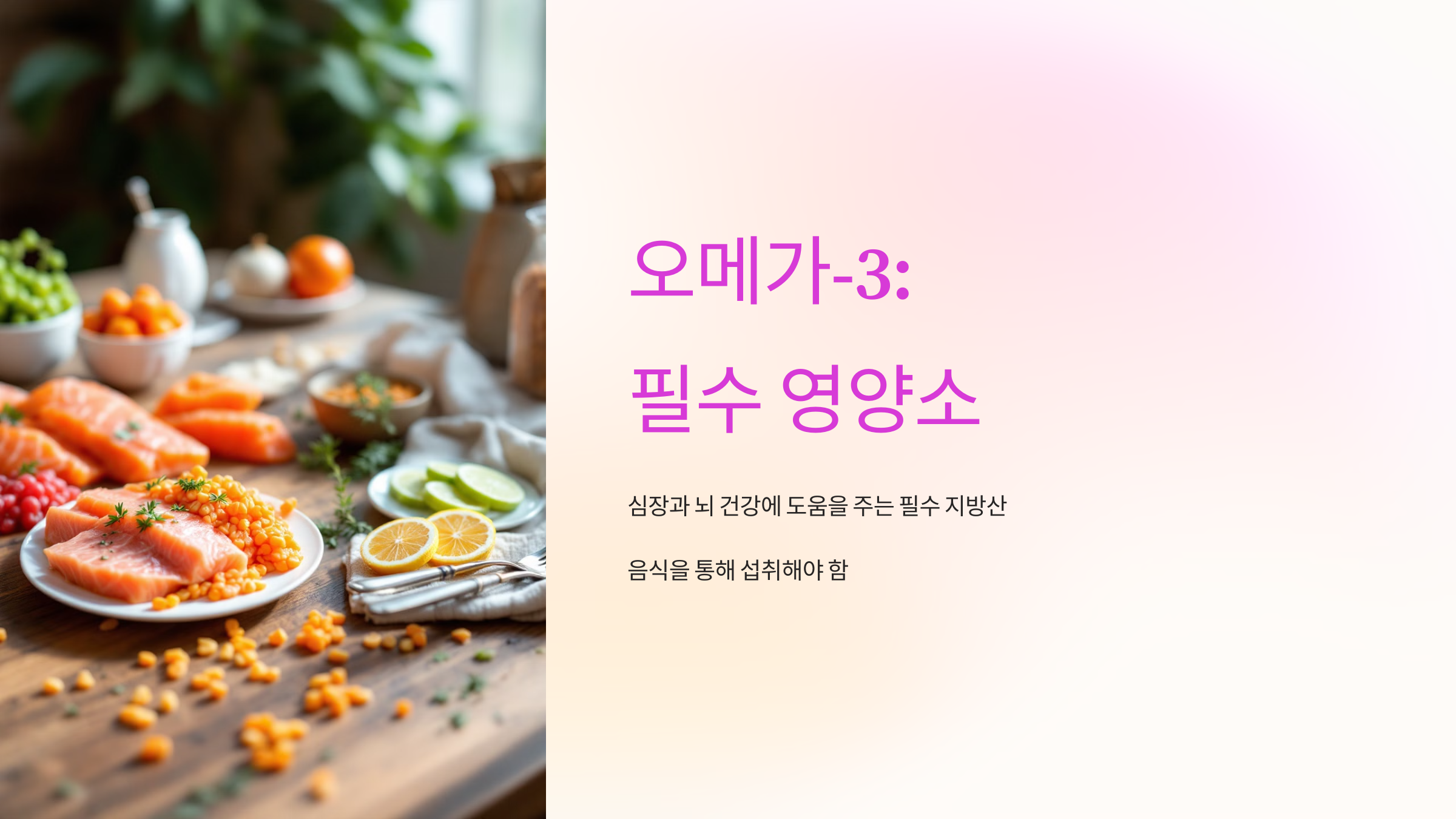 오메가-3는 우리가 건강을 유지하는 데 큰 도움을 주는 필수 지방산이에요. 건강기능식품 보충제와 식이요법을 활용해 꾸준히 섭취해 보세요. 여러분의 건강에 큰 차이를 만들 수 있답니다.