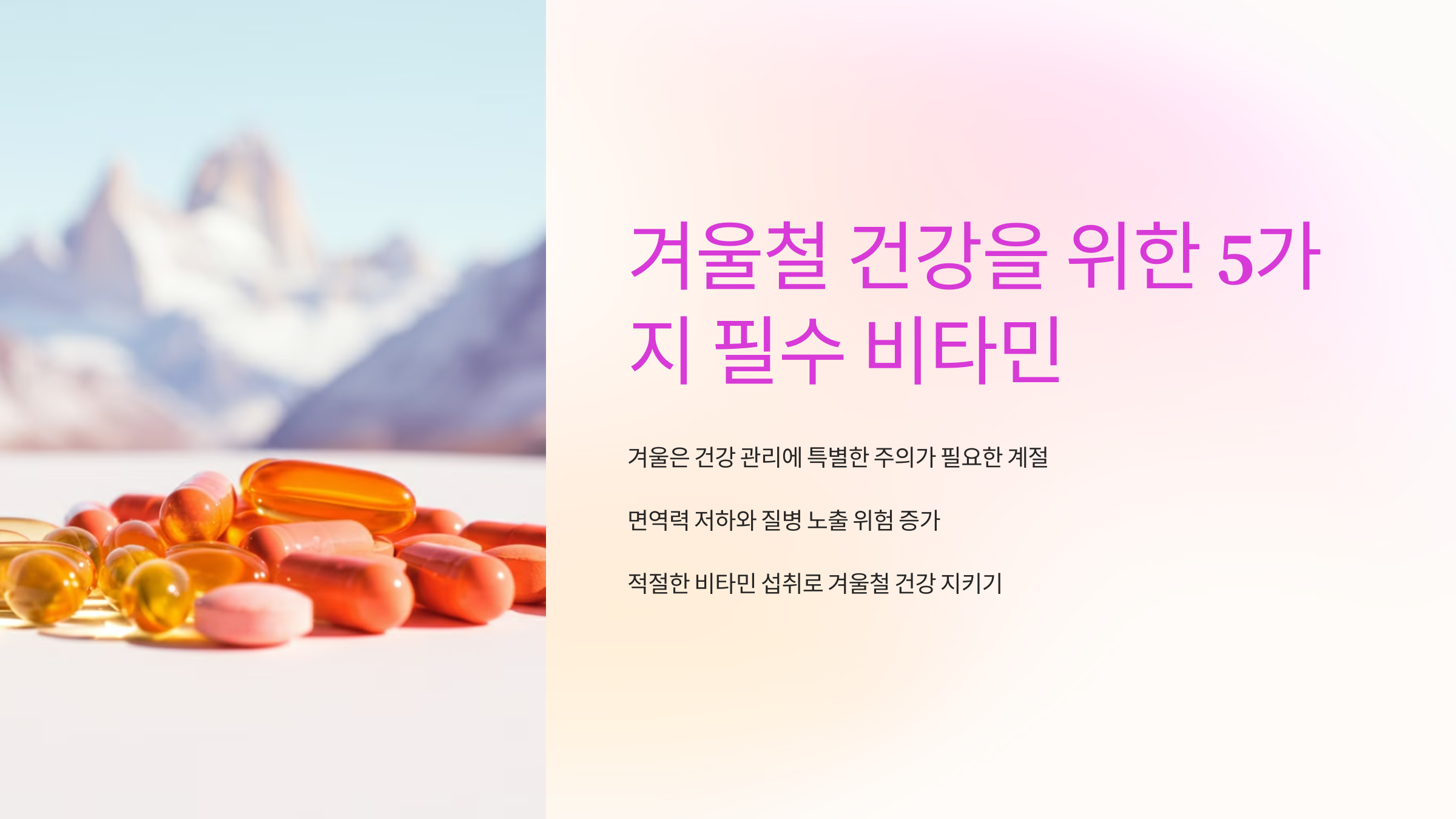 이번 글에서는 겨울철 건강을 지키기 위해 꼭 섭취해야 하는 5가지 주요 비타민을 소개합니다.
