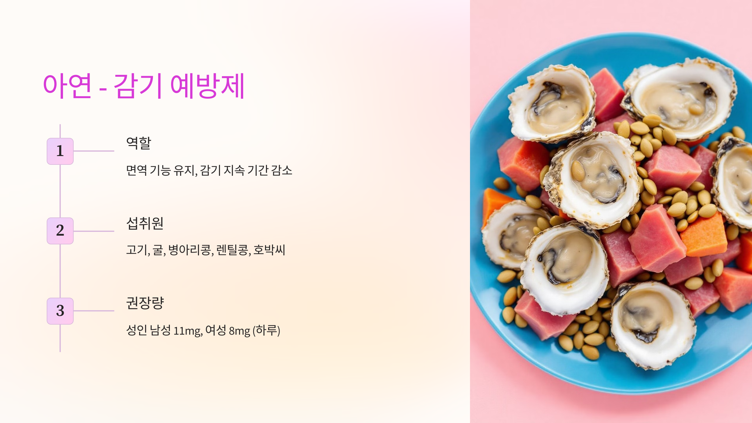 아연은 면역 기능 유지에 필수적인 미네랄로, 감기의 지속 기간을 줄이는 데 도움이 됩니다. 겨울철 바이러스에 대한 저항력을 높이는 데 중요한 역할을 합니다.