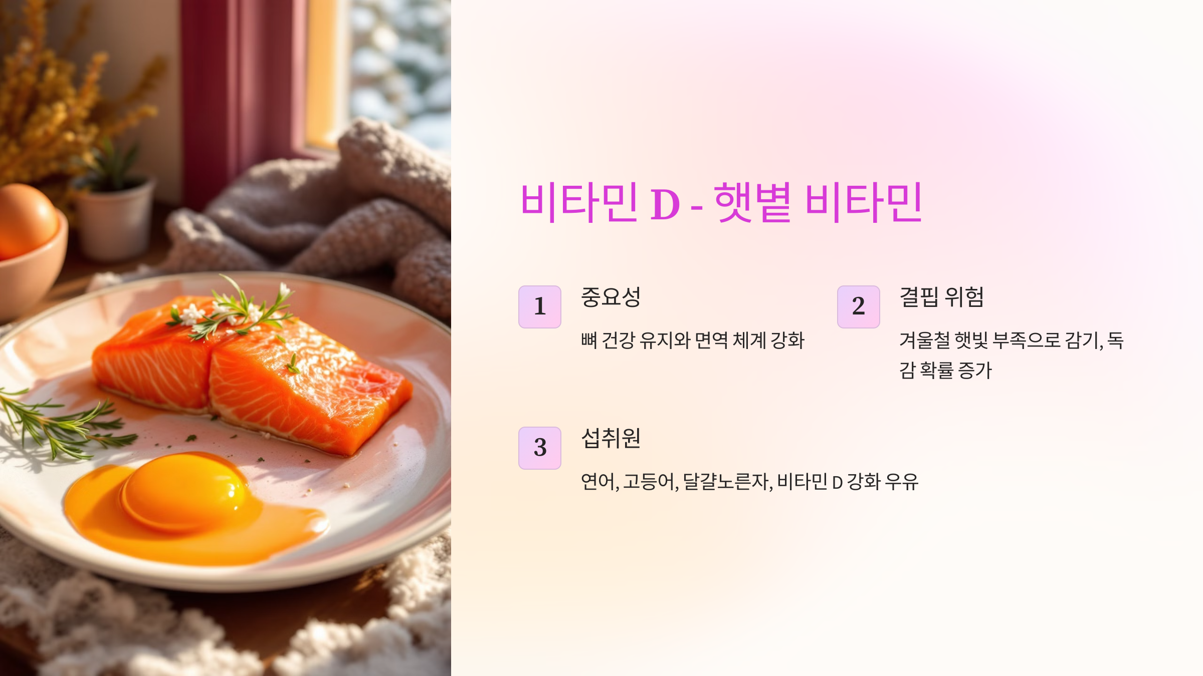 겨울에는 햇빛을 통한 비타민 D 생성이 부족해지기 쉬워 결핍이 발생할 수 있습니다.