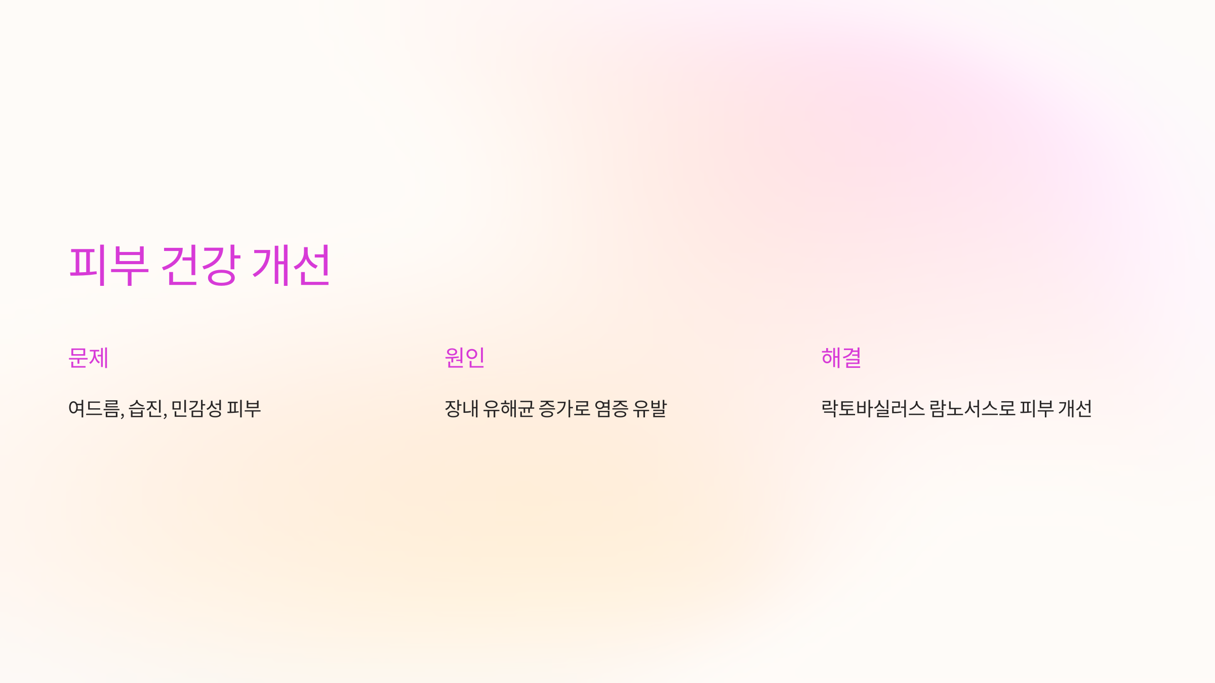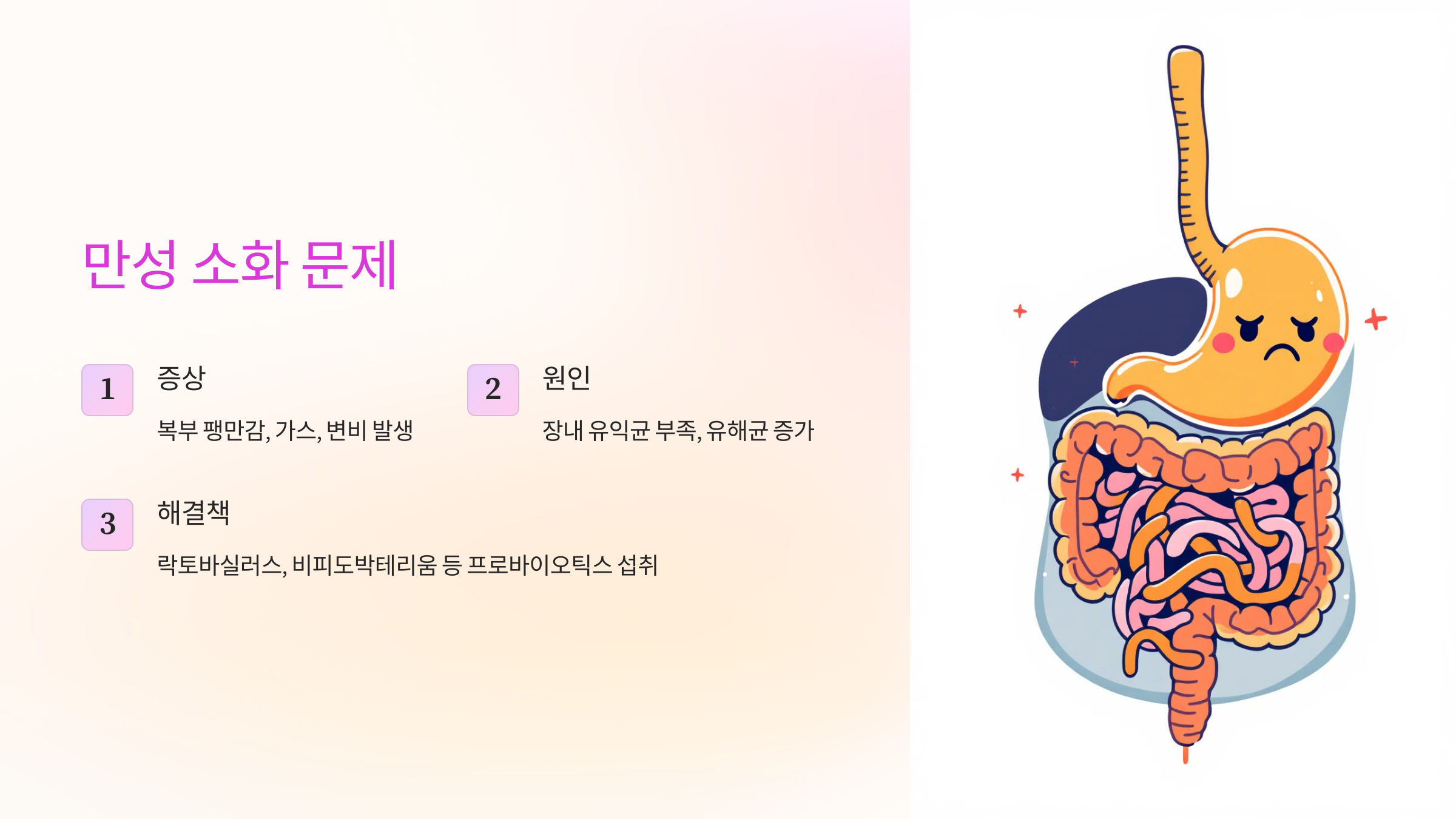 장내 균형이 깨지면 소화가 원활하지 않아 복부의 팽만감, 가스, 변비 등의 문제가 생길 수 있습니다. 이는 장내 유익균이 부족하고, 유해균이 많아졌다는 신호일 수 있습니다. 락토바실러스*와 *비피도박테리움 같은 특정 프로바이오틱스 균주는 장내 유익균의 수를 늘려 소화기 불편함을 완화하고 장 건강을 촉진하는 데 도움을 줍니다. 많이 들어보셨죠? 100억 유산균, 김치 / 모유 유래 유산균 같은거요. 이게 전체적으로 보면 프로바이오틱스 유산균이에요.