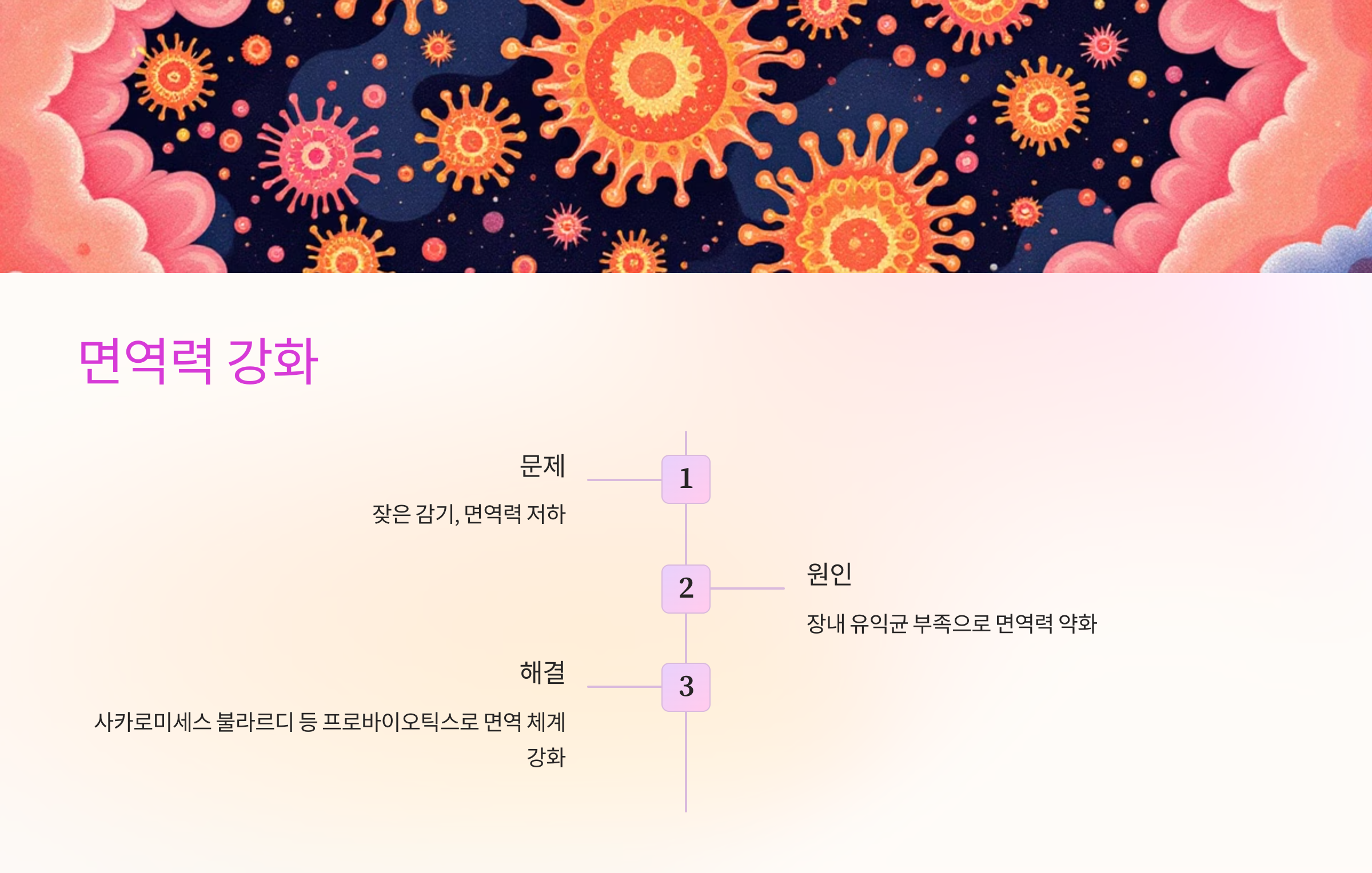 우리 면역 세포의 70%는 장에 존재합니다. 따라서 장내 유익균이 부족하면 면역력이 약해질 수 있습니다. 특히 감기나 감염성 질환에 자주 걸리는 경우, 프로바이오틱스를 통해 장내 미생물 균형을 회복시키는 것이 좋습니다. 사카로미세스 불라르디 같은 프로바이오틱스 균주는 면역 체계를 강화하고 유해균이 장내에서 번식하는 것을 억제해 면역력 향상에 도움이 됩니다. 장건강은 그만큼 우리의 면역력에도 영향을 주기에 필수적으로 꾸준히 섭취해야 합니다.