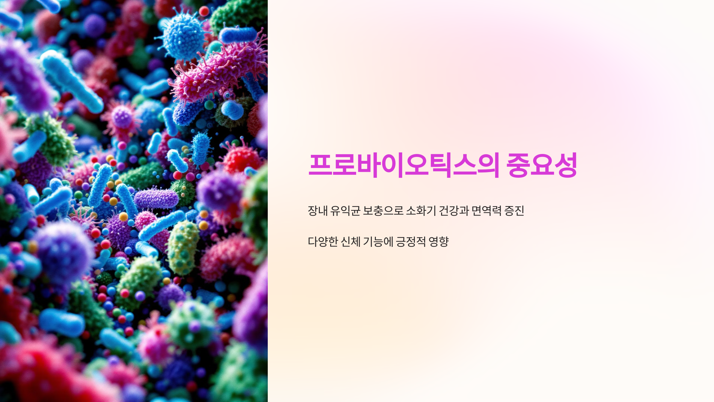 건강한 장은 건강한 몸의 시작입니다. 프로바이오틱스를 통해 장내 환경을 정비하여 더욱 활기찬 일상을 누리세요!