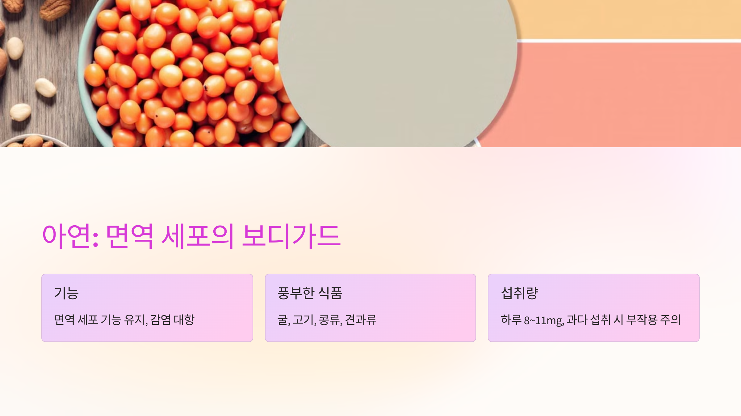 아연은 면역 세포의 기능을 유지하고 감염과 싸우는 데 필수적인 미네랄입니다. 특히 감기의 초기 증상을 줄이는 데 도움을 줄 수 있다는 연구 결과도 있습니다.