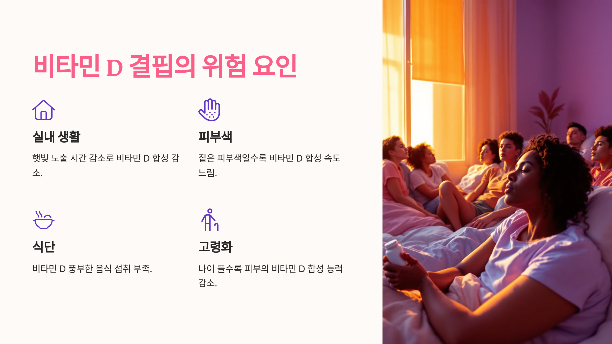 비타민 D 결핍은 현대인들에게 흔한 문제로, 특히 햇빛을 충분히 받지 못하는 환경이나 생활 방식을 가진 사람들에게서 자주 발생합니다. 주요 위험 요인은 다음과 같습니다.