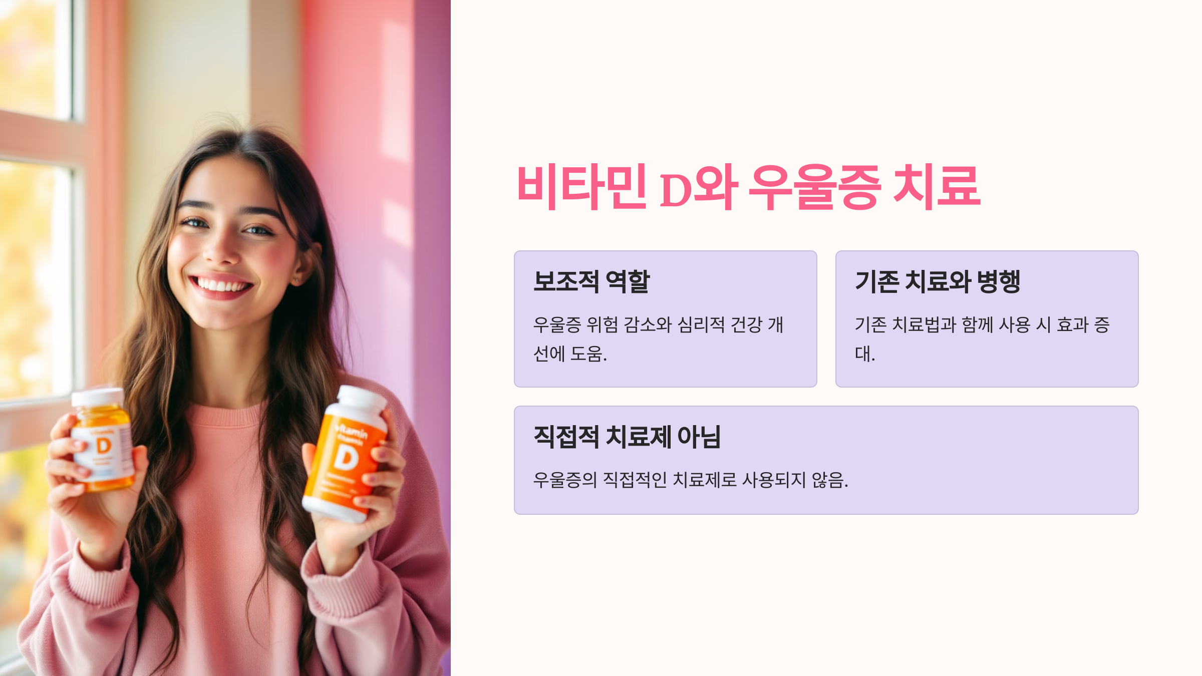 비타민 D는 우울증 치료의 직접적인 약물이 아닙니다. 그러나 비타민 D 결핍으로 인한 우울증 위험을 줄이고 심리적 건강을 개선하는 데 보조적인 역할을 할 수 있습니다. 이는 기존의 치료법과 병행하여 심리적 안정감을 높이는 데 도움을 줄 수 있습니다.