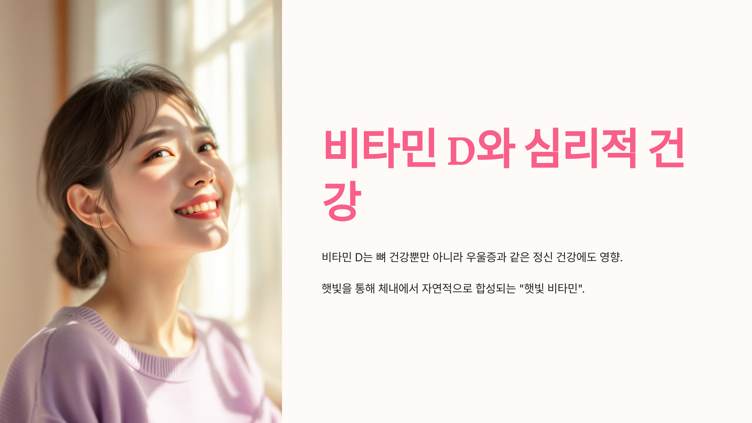 비타민 D는 신체 건강뿐만 아니라 심리적 건강에도 영향을 미칠 수 있는 중요한 영양소입니다. 생활 습관을 개선하고 적절한 섭취를 통해 더 건강한 삶을 누릴 수 있기를 바랍니다.