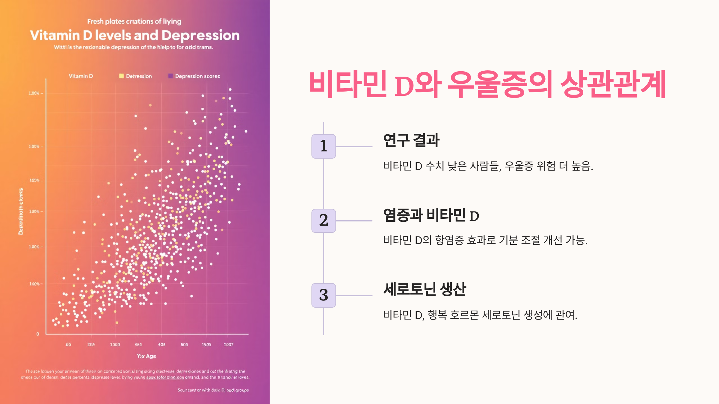 한 메타 분석에 따르면, 비타민 D 수치가 낮은 사람들은 그렇지 않은 사람들에 비해 우울증 위험이 더 높았습니다. 특히, 비타민 D 보충제를 복용한 집단에서 우울증 증상이 완화된 사례도 보고되었습니다. - 염증과 비타민 D