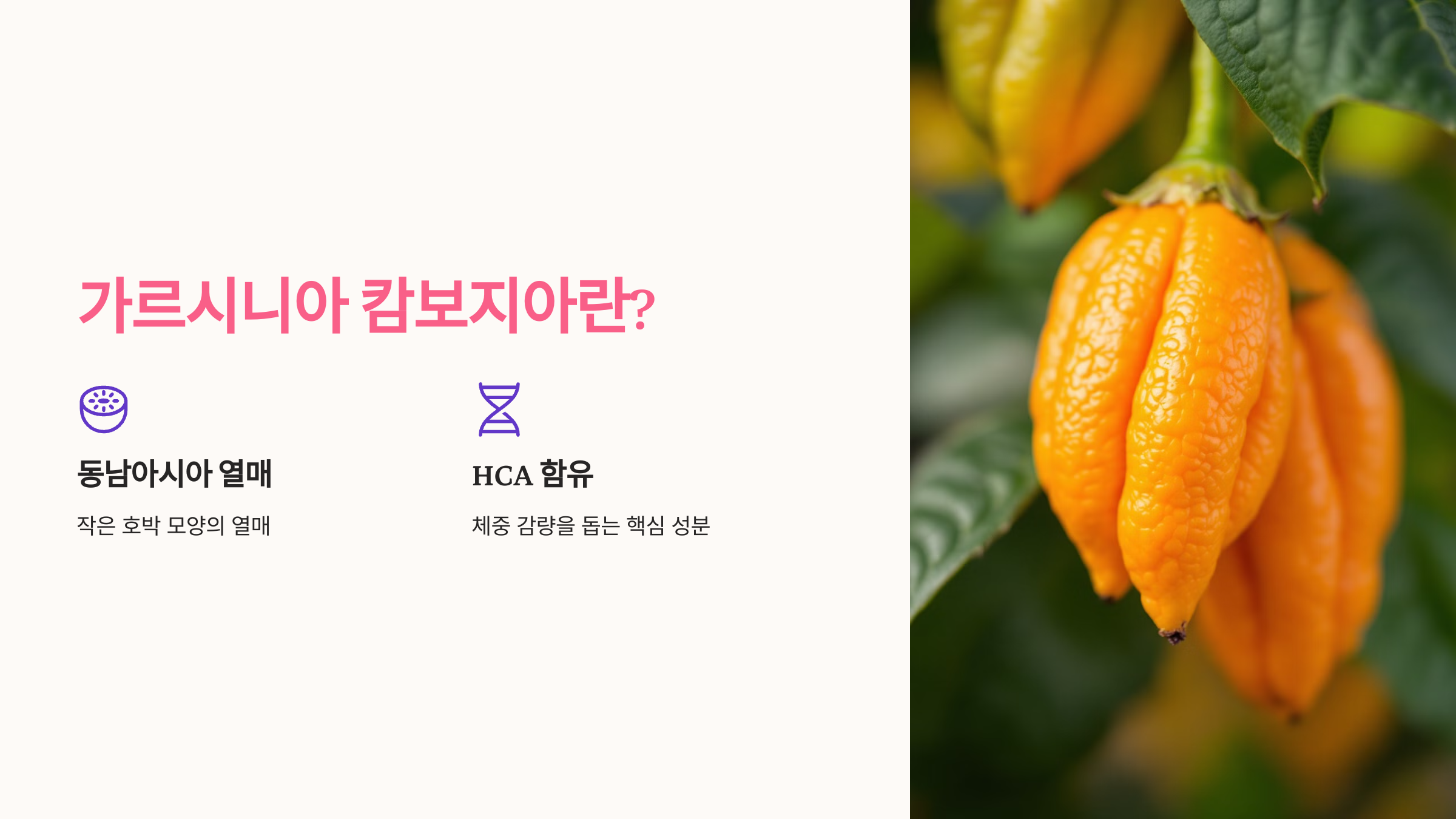 가르시니아는 동남아시아에서 자라는 작은 호박 모양의 열매예요. 이 열매의 껍질에는 HCA(하이드록시시트릭산)이라는 성분이 들어 있는데요, 이 성분이 바로 체중 감량을 돕는 핵심 역할을 해요.
