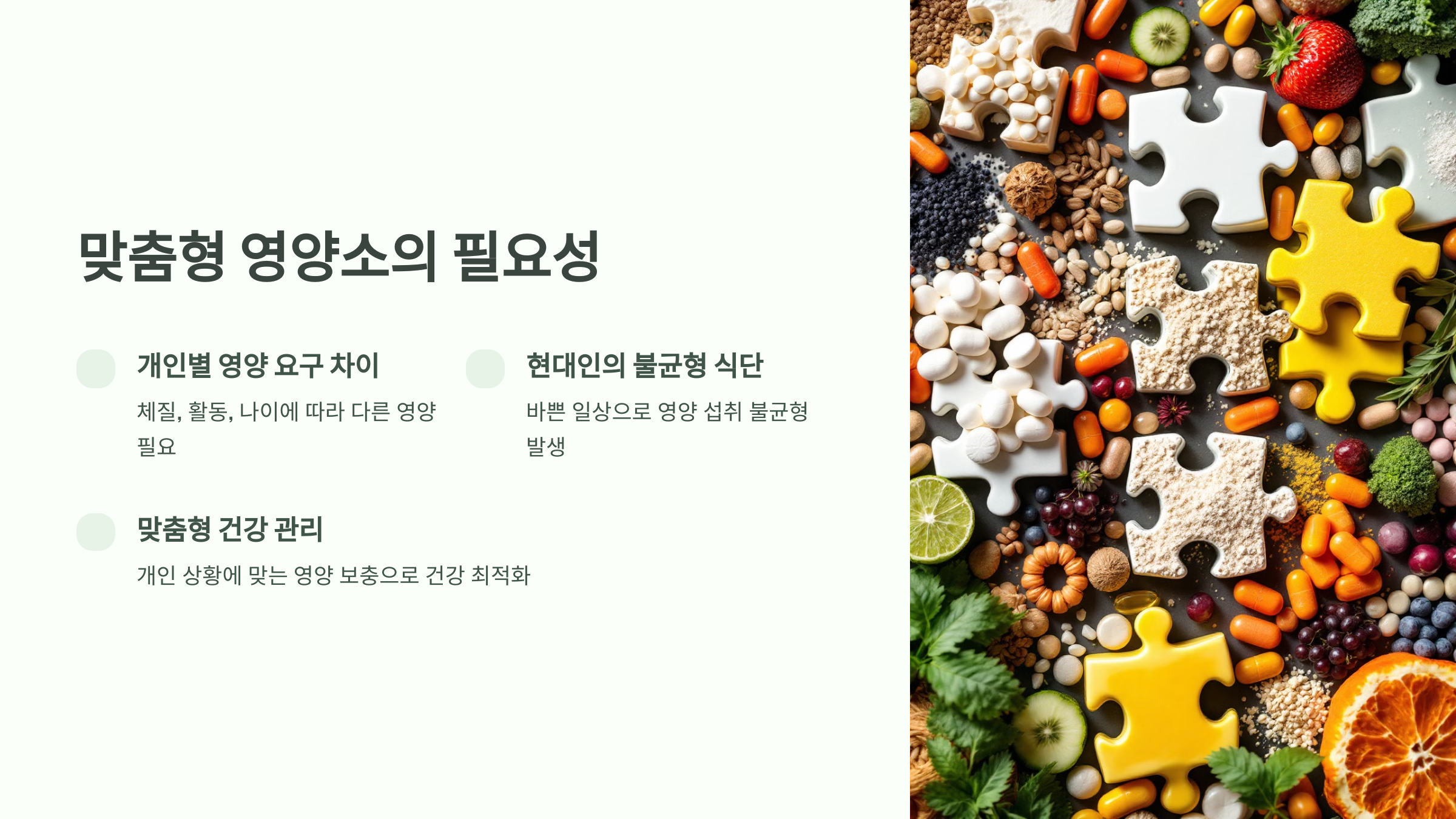이렇게 각자의 상황에 맞춰 영양을 채워주는 것이 맞춤형 건강 관리의 핵심이에요. 👌