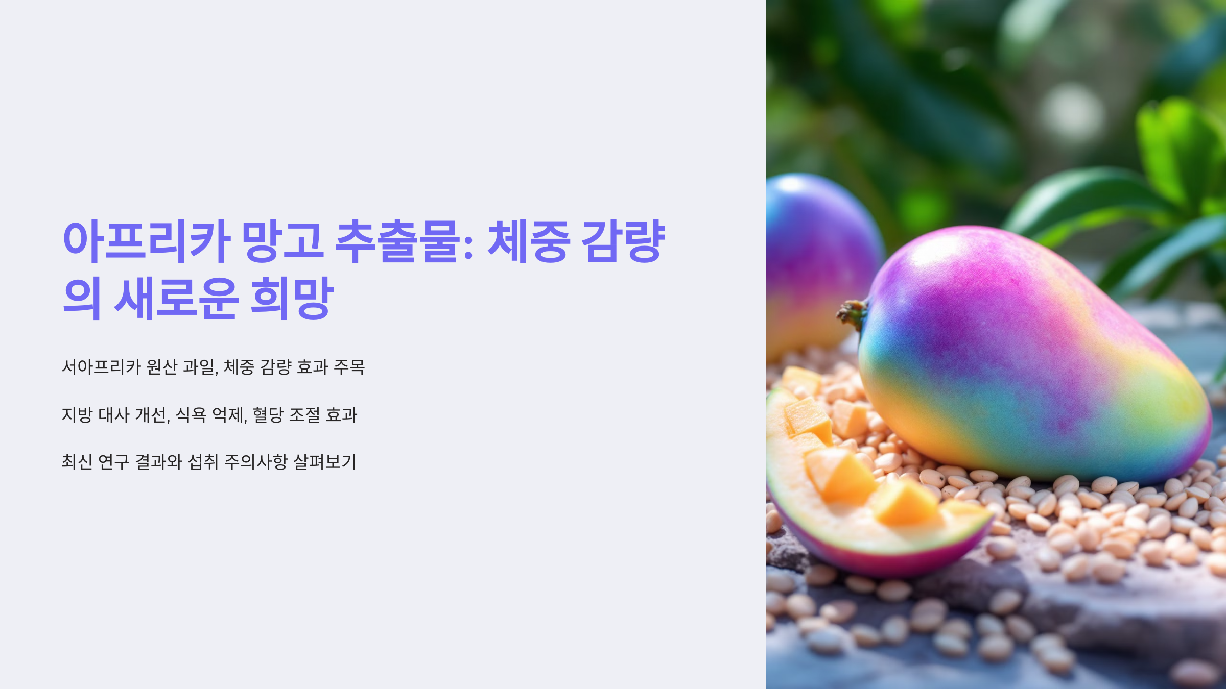이 글에서는 아프리카 망고 추출물(AME, African Mango Extract)의 체중 감량 효과와 관련된 최신 연구 결과를 바탕으로 그 효능과 섭취 시 주의사항을 자세히 살펴봅니다.