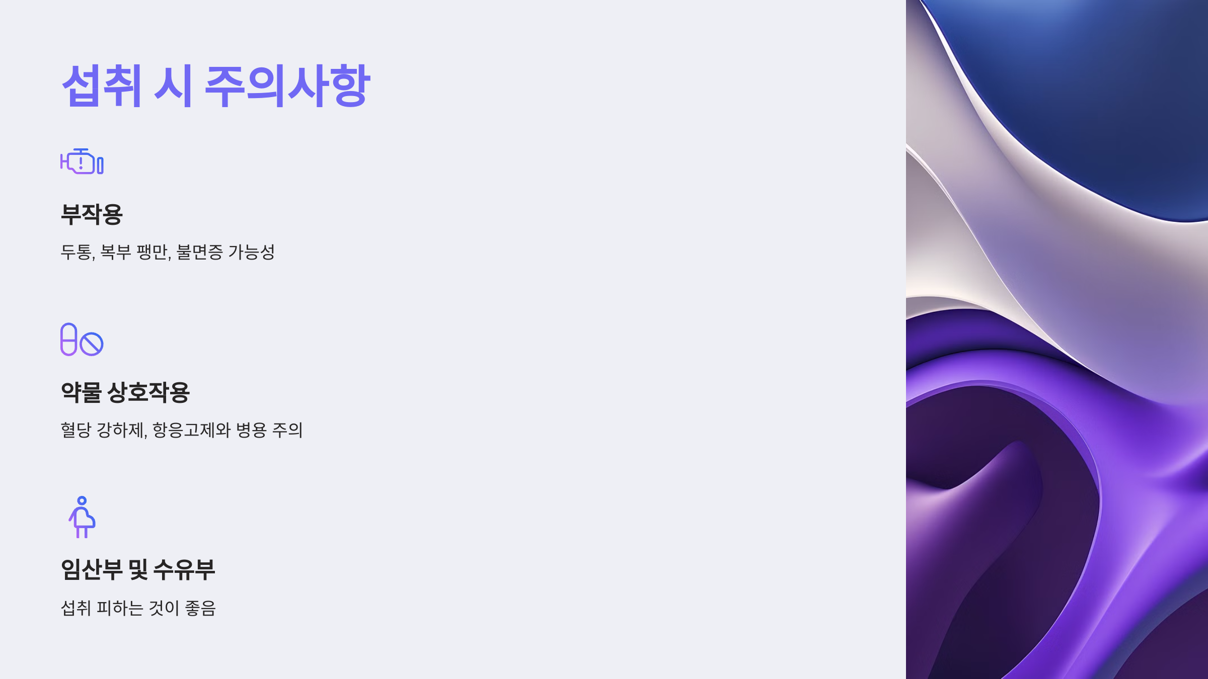 혈당 강하제나 항응고제와 병용할 경우 부작용이 발생할 가능성이 있습니다. 따라서 복용 중인 약물이 있다면 반드시 의사와 상담해야 합니다. - 임산부 및 수유부