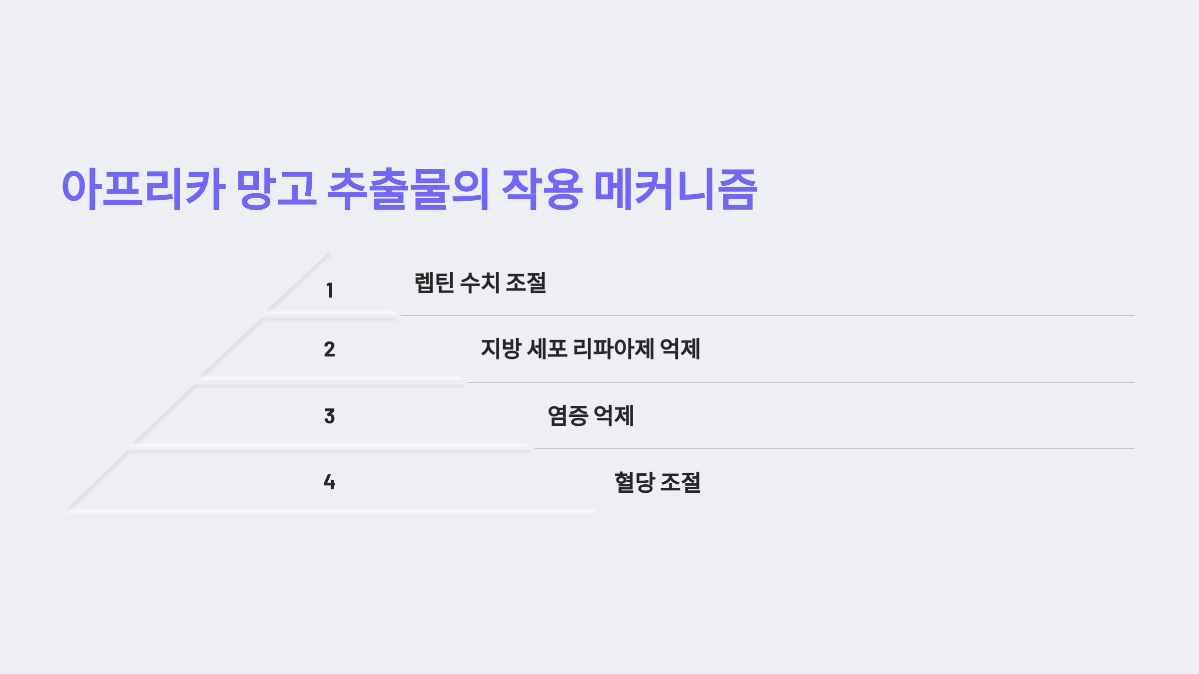 아프리카 망고 추출물이 이러한 효과를 보이는 이유는 다음과 같은 생리학적 작용 메커니즘 때문입니다: