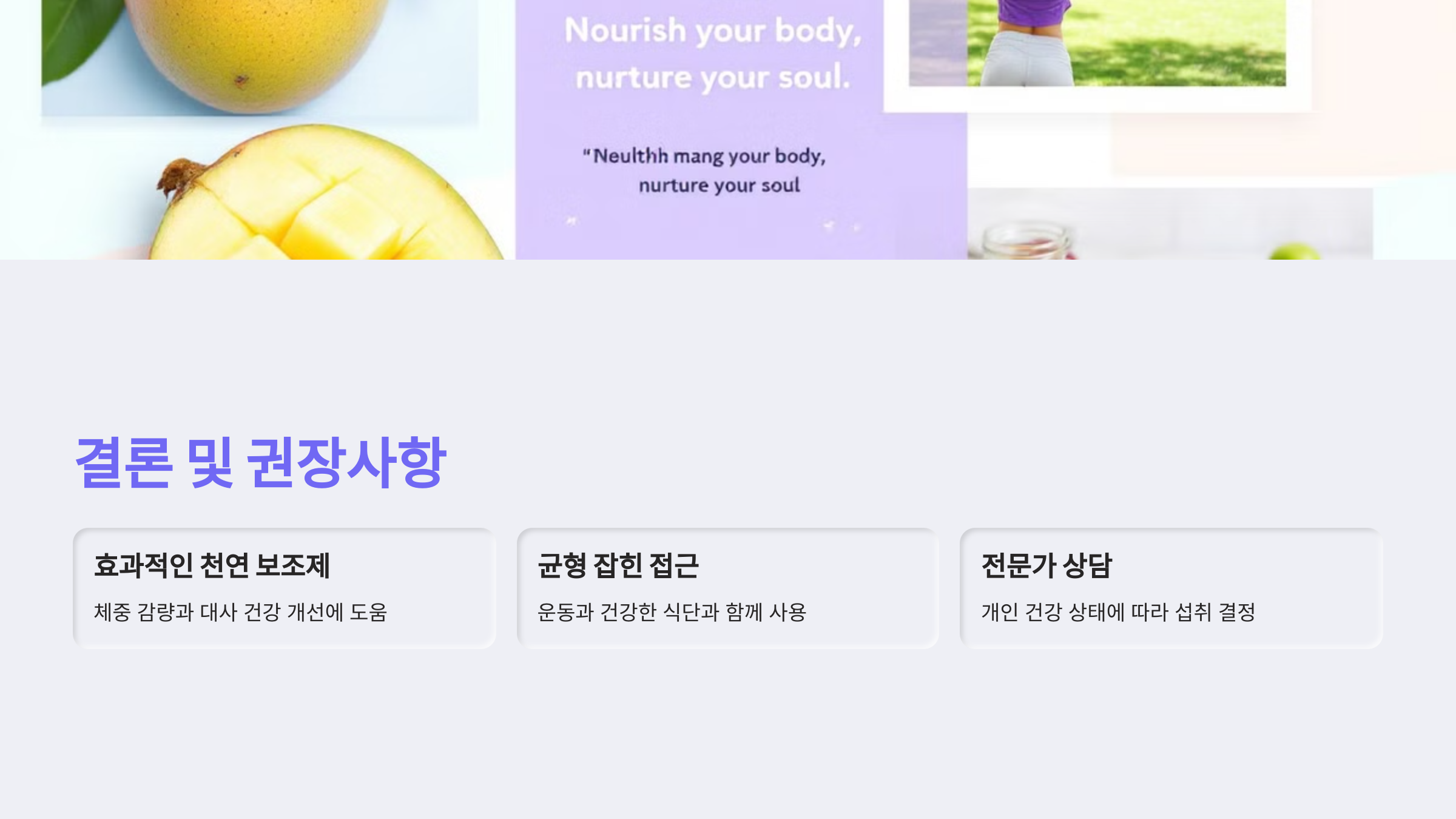 아프리카 망고 추출물은 체중 감량과 대사 건강 개선에 효과적인 천연 보조제로, 최근 연구들을 통해 그 효능이 점점 더 입증되고 있습니다. 체중 감량뿐 아니라 대사 증후군 예방 및 혈중 지질 개선 효과를 통해 심혈관 건강에도 긍정적인 영향을 미칠 수 있습니다. 그러나, 효과를 극대화하려면 규칙적인 운동과 균형 잡힌 식단과 함께 사용하는 것이 중요하며, 섭취 전에 개인의 건강 상태에 따라 전문가와 상담하는 것이 필요합니다.