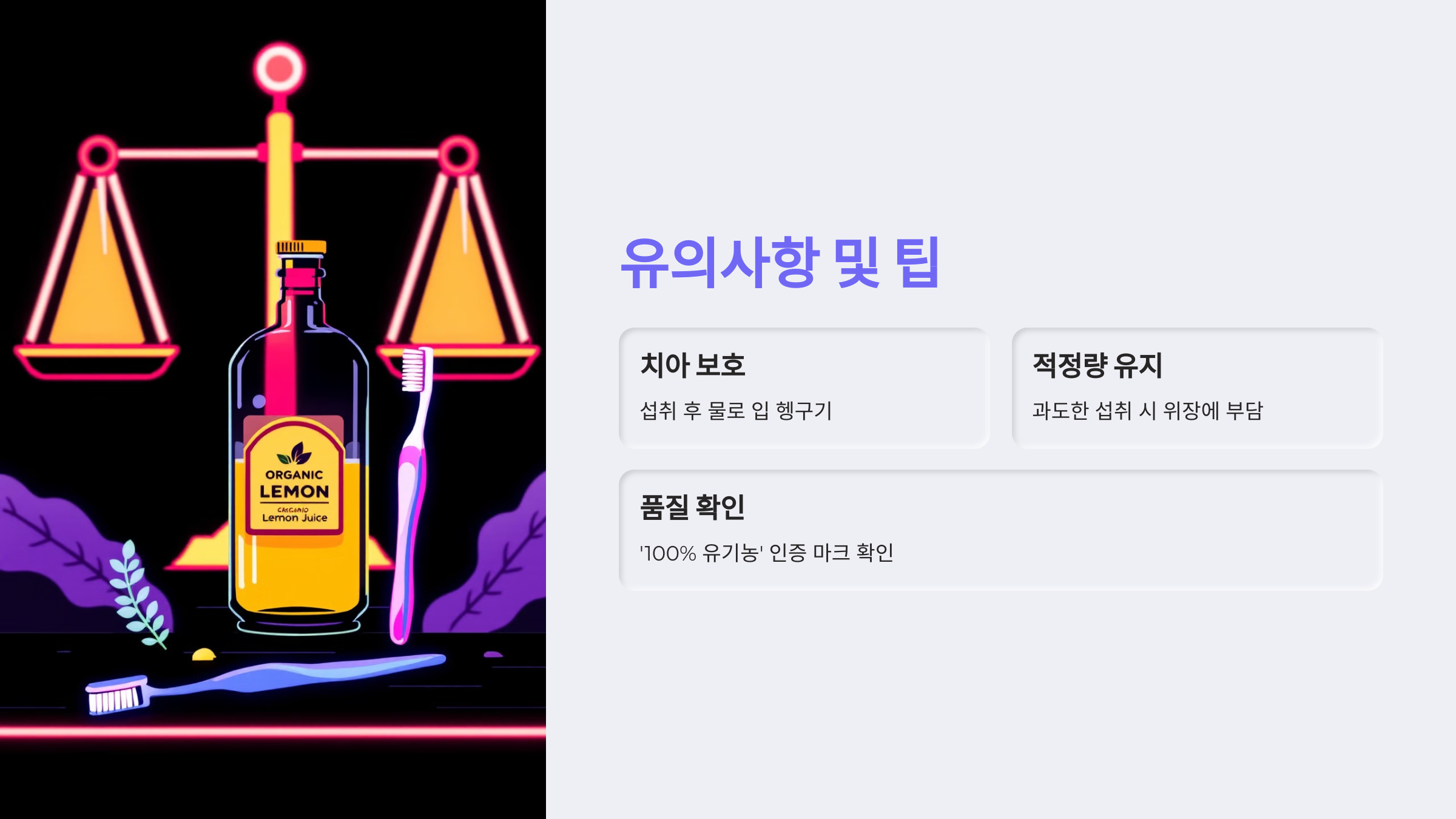 - 레몬즙은 산도가 높기 때문에, 섭취 후 입안을 물로 헹궈 치아 에나멜 손상을 예방하세요.