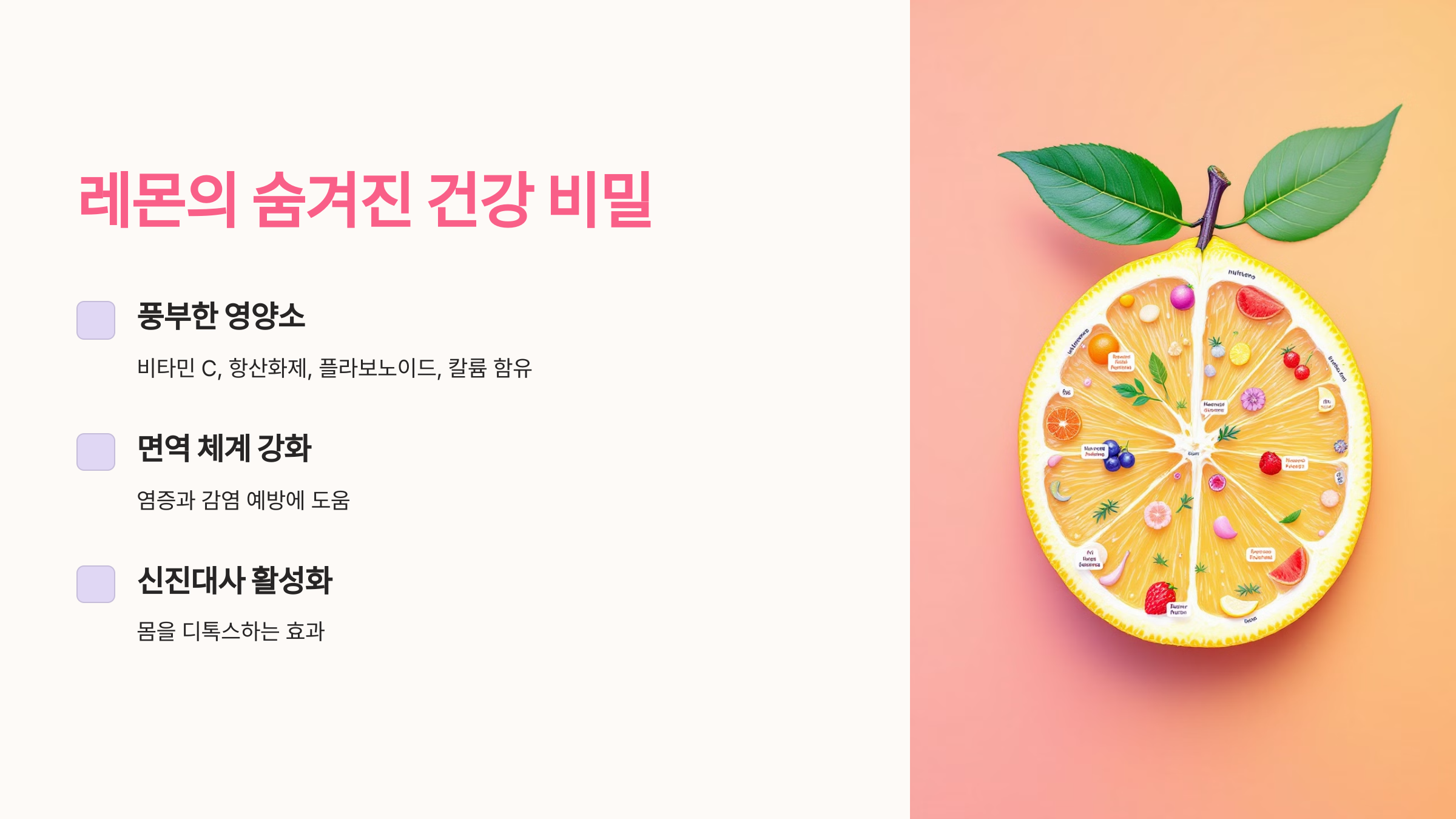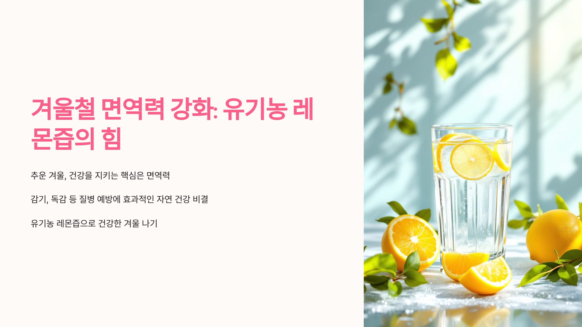 추운 겨울, 건강을 지키기 위해 가장 중요한 것은 바로 면역력입니다. 기온이 낮아지고 실내외 온도 차가 커질수록 감기, 독감 등 다양한 질병에 노출되기 쉽기 때문인데요. 이런 계절에 특히 효과적인 자연 건강 비결이 있습니다. 바로 유기농 레몬즙을 활용하는 것입니다!