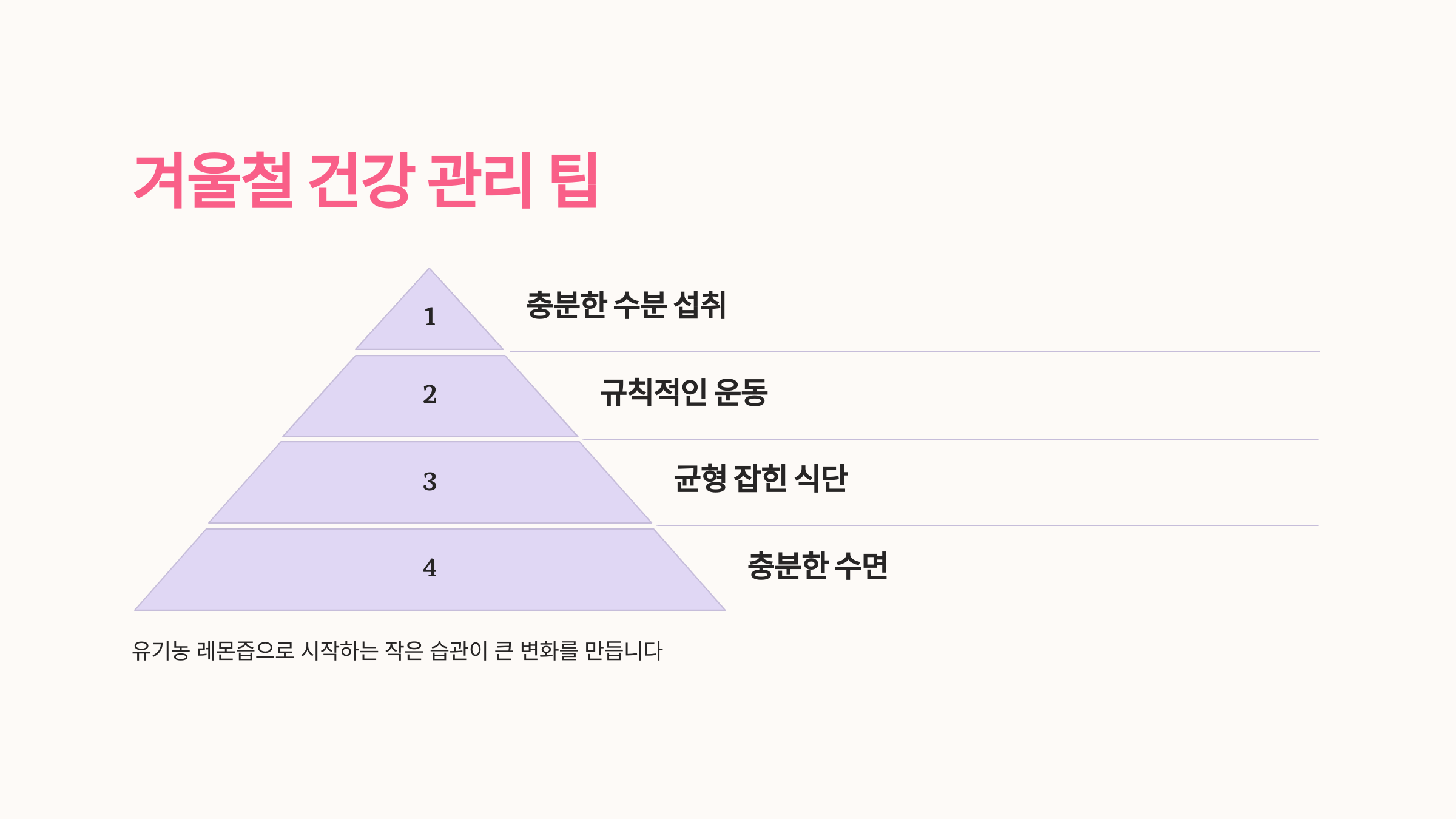 유기농 레몬즙은 겨울철 면역력 강화에 큰 도움을 주지만, 이것만으로는 완벽하지 않습니다. 아래 몇 가지 건강 관리 팁도 함께 실천해 보세요: