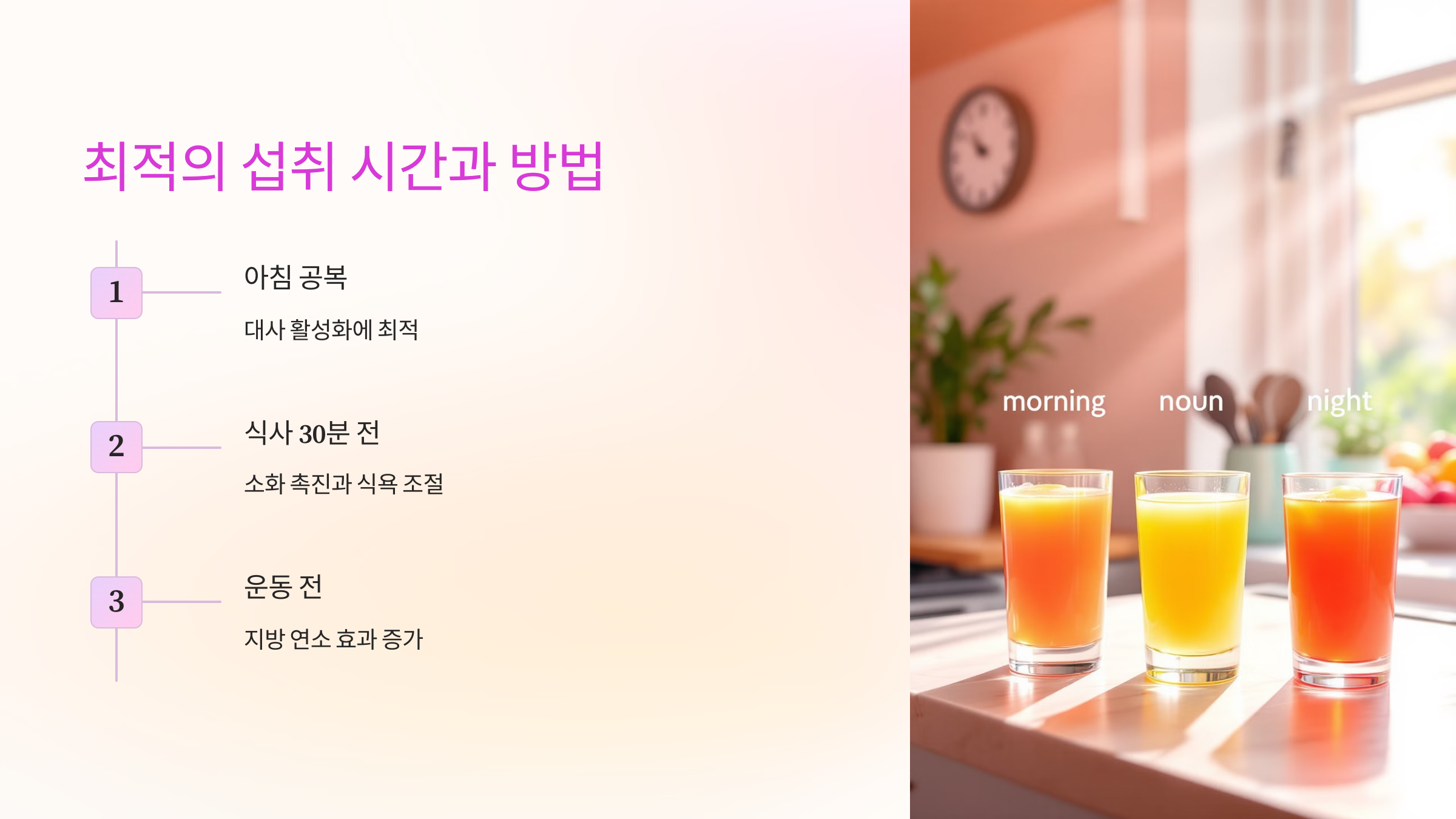 - 아침 공복: 대사 활성화에 최적