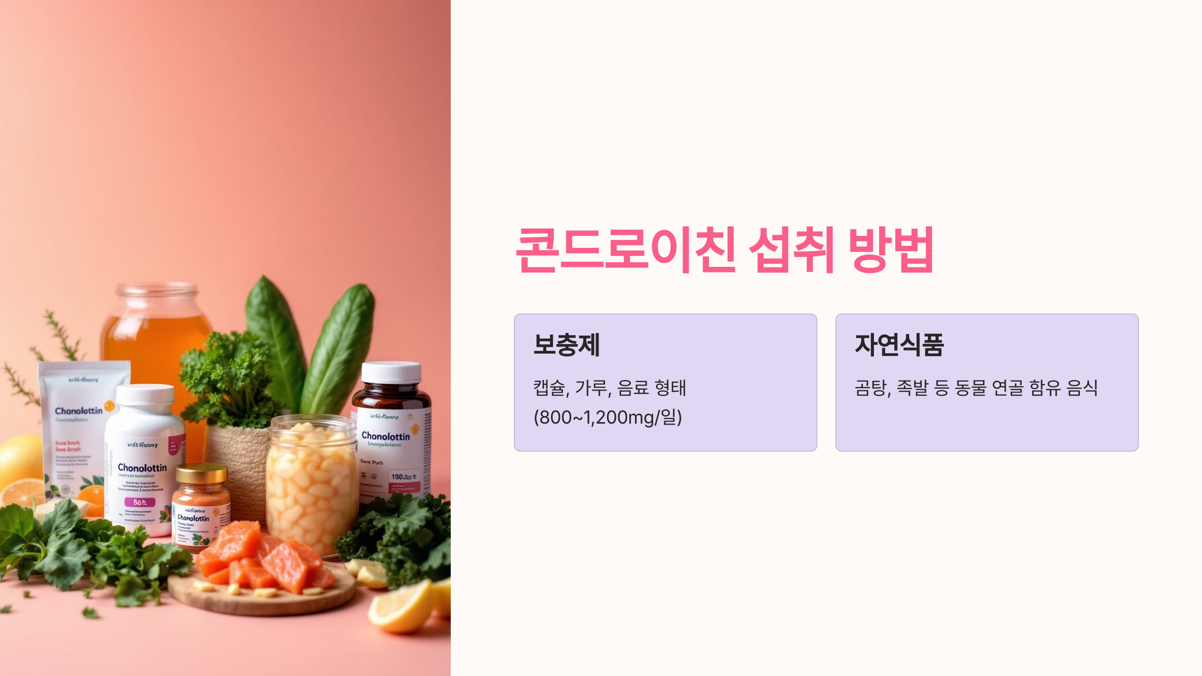 보충제 형태의 콘드로이친은 가장 일반적인 섭취 방법입니다. 일반적으로 하루 800~1,200mg 섭취가 권장되며, 개인의 상태에 따라 복용량은 조정될 수 있습니다.