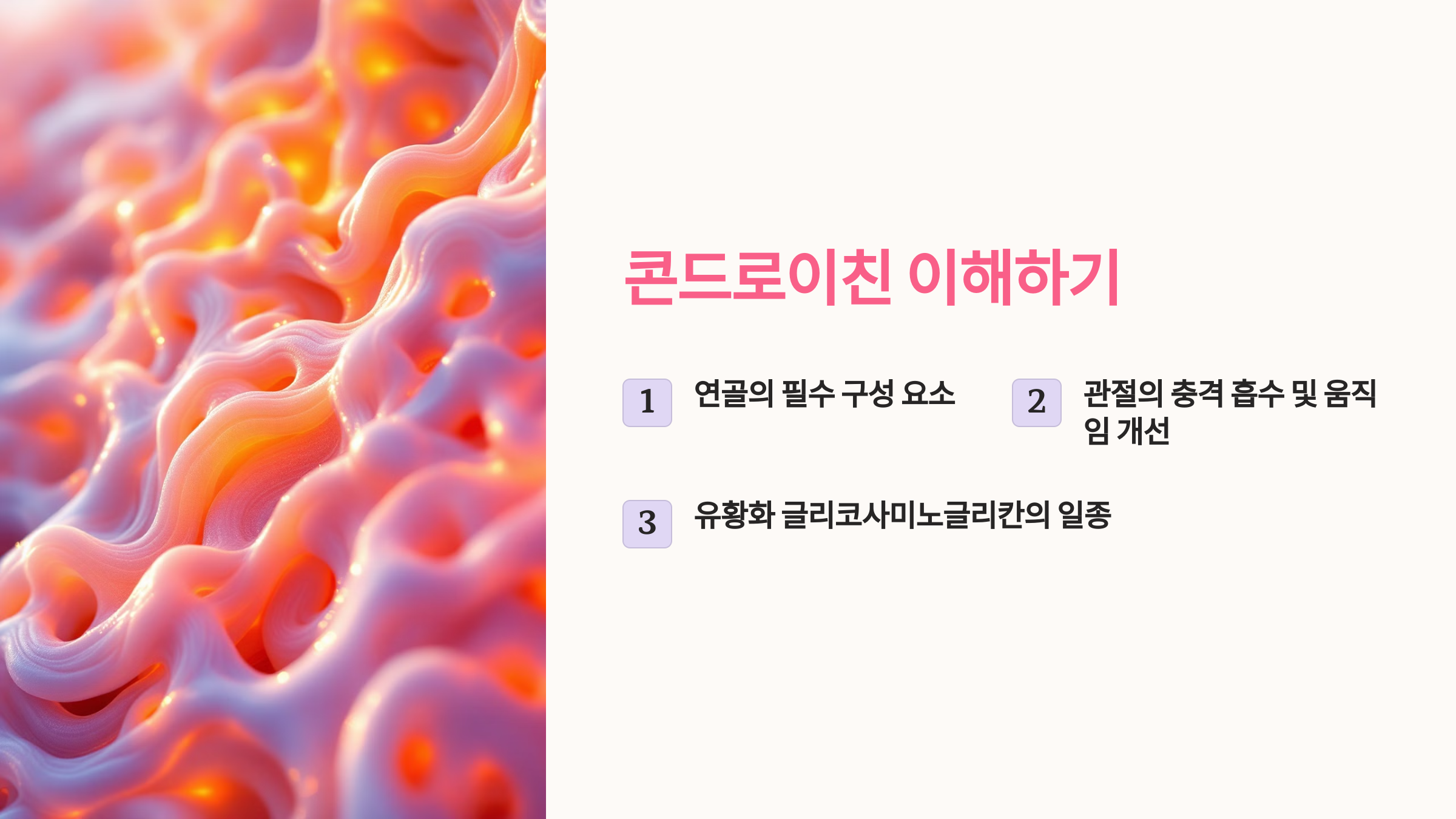 콘드로이친은 연골의 필수 구성 요소 중 하나로, 관절 건강에 중요한 역할을 합니다. 우리 관절은 충격을 흡수하고 매끄럽게 움직일 수 있도록 연골이라는 쿠션을 가지고 있습니다. 콘드로이친은 이 연골을 구성하는 물질로, 유황화 글리코사미노글리칸(Sulfated Glycosaminoglycan)이라는 복잡한 이름을 가진 성분입니다. 쉽게 말해, 연골이 유연하고 탄력 있게 유지되도록 도와주는 핵심 성분입니다.