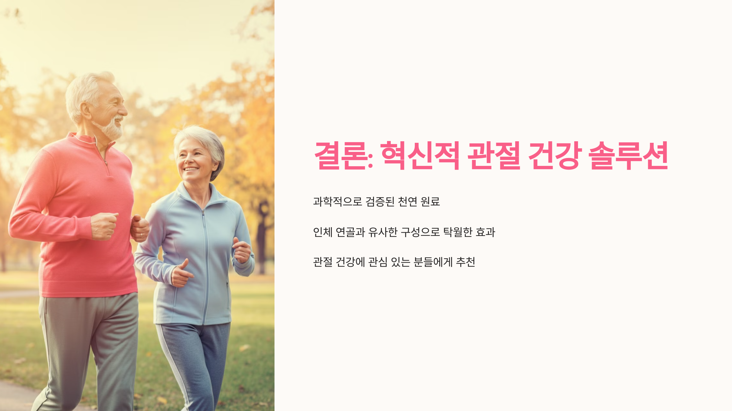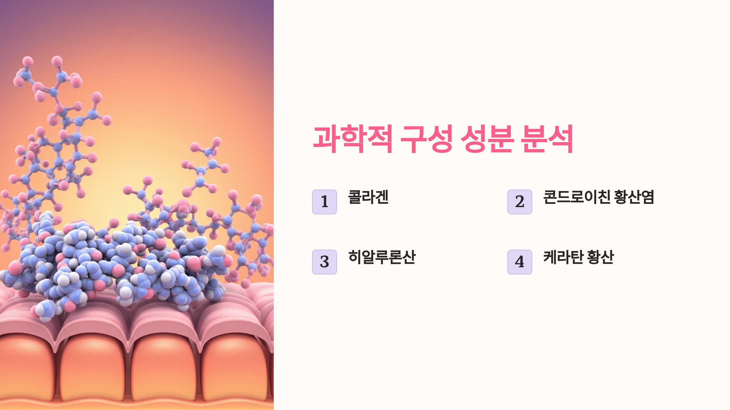 이러한 성분들은 인체 연골의 구조와 거의 동일한 구성을 보여, 관절 건강에 매우 효과적입니다[1][4].